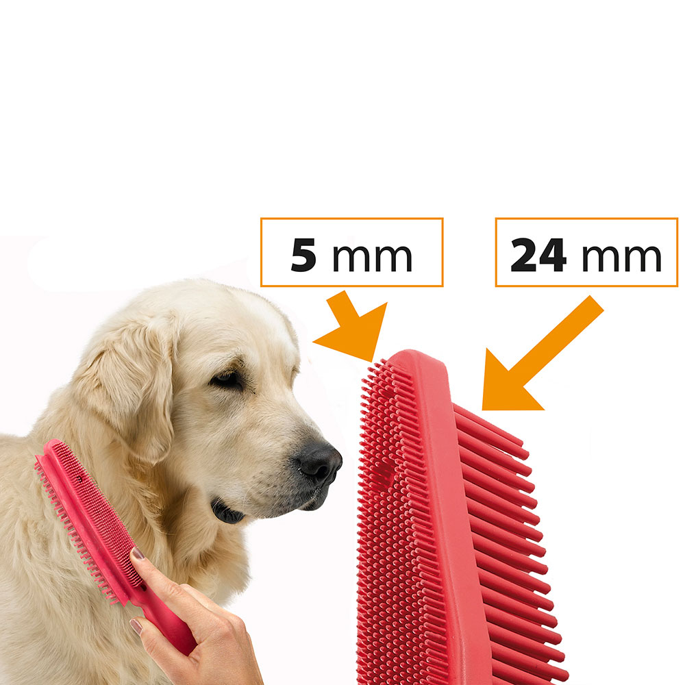 Ferplast GRO 5941 е много необходима гумена четка за премахване на мъртва козина от любимеца ви и на кучешки косми от мебели с плат. От двете страни има гребени с различни размери – 5 мм и 24 мм – за различни типове козина: къса, средна или дълга. Сладката дръжка във формата на лапичка има отвор за окачване.