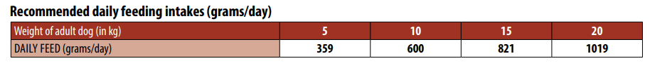 ИНСТРУКЦИИ ЗА ХРАНЕНЕ: препоръчителни дневни дажби за куче от средна порода (12-30кг): 700-1380гр; може да се раздели на 2 приема. Давайте храната със стайна темперарура. След отваряне да се съхранява в хладилник и да се консумира в рамките на 2 дни. Не отваряйте, ако опаковката е повредена или издута. Съхранявайте на сухо и хладно. Винаги осигурявайте достъп до прясна и чиста вода. Само за кучета, не е подходяща за човешка консумация.