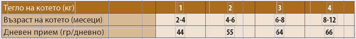 ИНСТРУКЦИИ ЗА УПОТРЕБА: Препоръчителният дневен хранителен прием (вижте таблицата) може да бъде разделен на 2 дневни хранения. Индивидуалните хранителни нужди могат да варират в зависимост от размера, възрастта и нивото на активност на животното. Трябва да има прясна и чиста вода на разположение по всяко време. Когато този продукт замества друг вид храна и/или диета, се препоръчва да се въведе постепенно за период от поне една седмица.