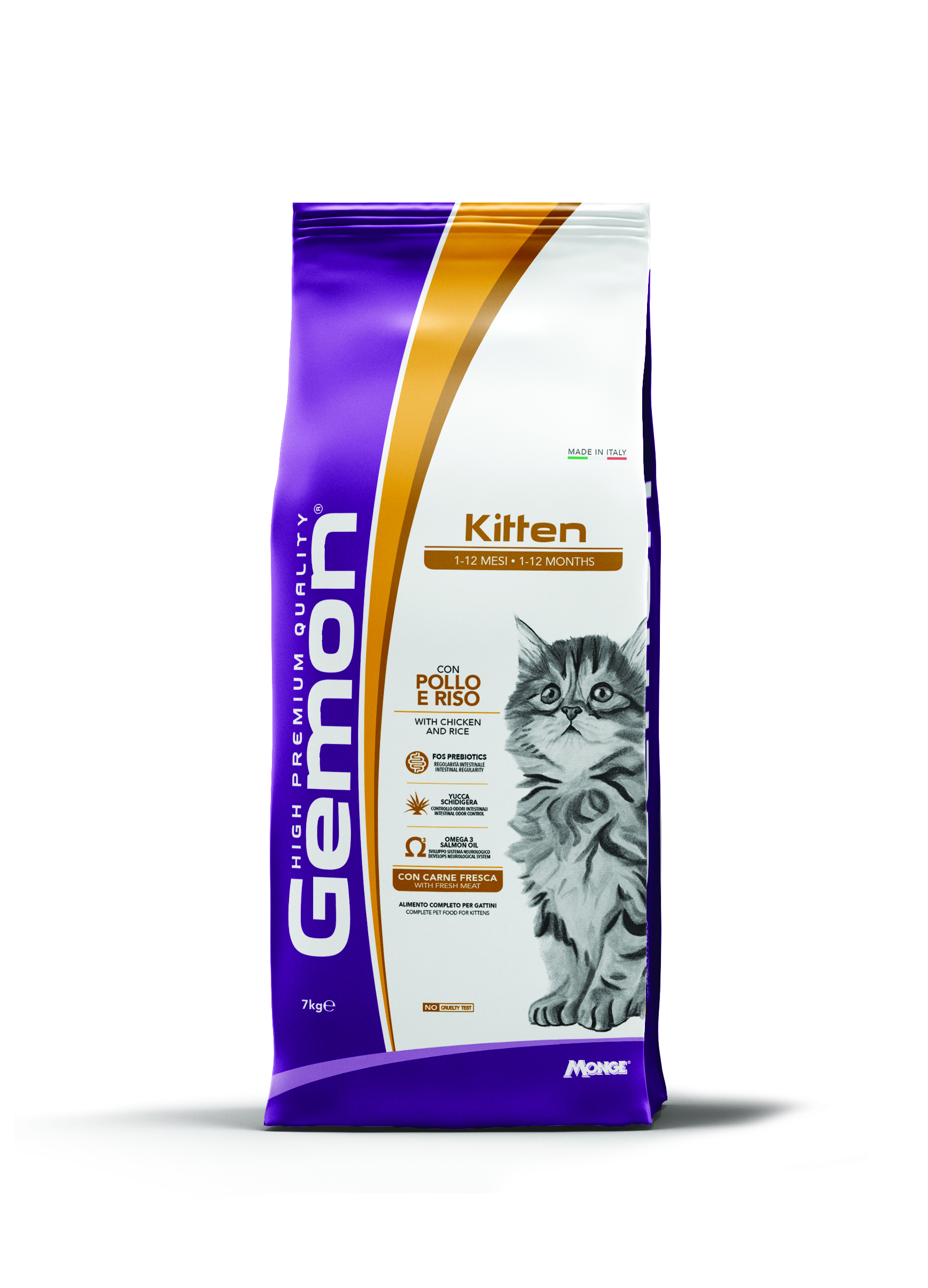 GEMON KITTEN (1-12 МЕСЕЦА) С ПИЛЕ И ОРИЗ е пълноценна храна за подрастващи котенца. Формулата се характеризира с висококачествени съставки като пиле, източник на основни хранителни вещества, и ориз, източник на въглехидрати, направени високосмилаеми благодарение на процеса на екструзия. Балансирана диета, с добавени пребиотици фрукто-олигозахариди (FOS) и манo-олигозахариди (MOS) за поддържане на чревното здраве, и с юка шидигера за ограничаване миризмата на фекалиите. Рецептата съдържа прясно месо за оптимален вкус и масло от сьомга, източник на омега-3, за подпомагане на нормалното развитие на неврологичната система по време на растежа. Без добавени оцветители и изкуствени консерванти.