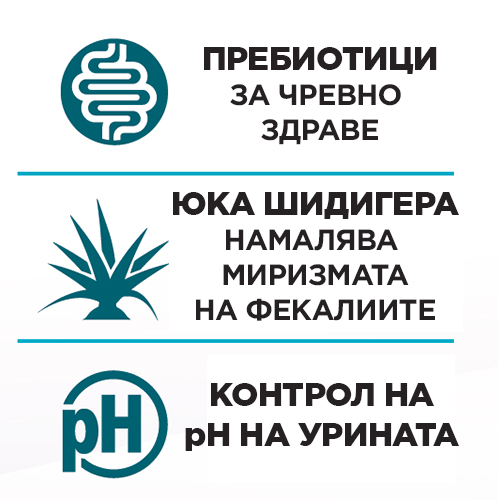ДОБАВКИ: ХРАНИТЕЛНИ ДОБАВКИ/kg: Витамин A (ретинил ацетат) 30 700 IU, витамин D3 1 610 IU, витамин E (ал-рак-алфа-токоферил ацетат) 72 mg, холин хлорид 1 500 mg, селен (натриев селенит 0,2 mg) 0,1 mg, манган (манганов сулфат монохидрат 57 mg) 18 mg, цинк (цинков оксид 109 mg) 87 mg, мед (меден (II) сулфат пентахидрат 29 mg) 7,5 mg, желязо (желязо (II) сулфат монохидрат 190 mg) 62,5 mg, Йод (безводен калциев йодат 1,5 mg) 1 mg, таурин 1200 mg, вещества, подкисляващи урината: DL-метионин (технически чист): 1000 mg. ТЕХНОЛОГИЧНИ ДОБАВКИ: Антиоксиданти.