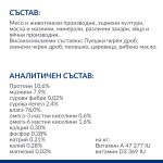 СЪСТАВ: Месо и животински производни, зърнени култури, масла и мазнини, минерали, различни захари, яйца и яйчни производни. Лесносмилаеми съставки: Пуешки черен дроб, свински черен дроб, пилешко, царевица, рибено масло.