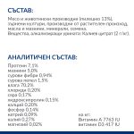 СЪСТАВ: Месо и животински производни (пилешко 13%), зърнени култури, производни от растителен произход, масла и мазнини, минерали, семена. Вещества, алкализиращи урината: Калиев цитрат (2 г/кг).