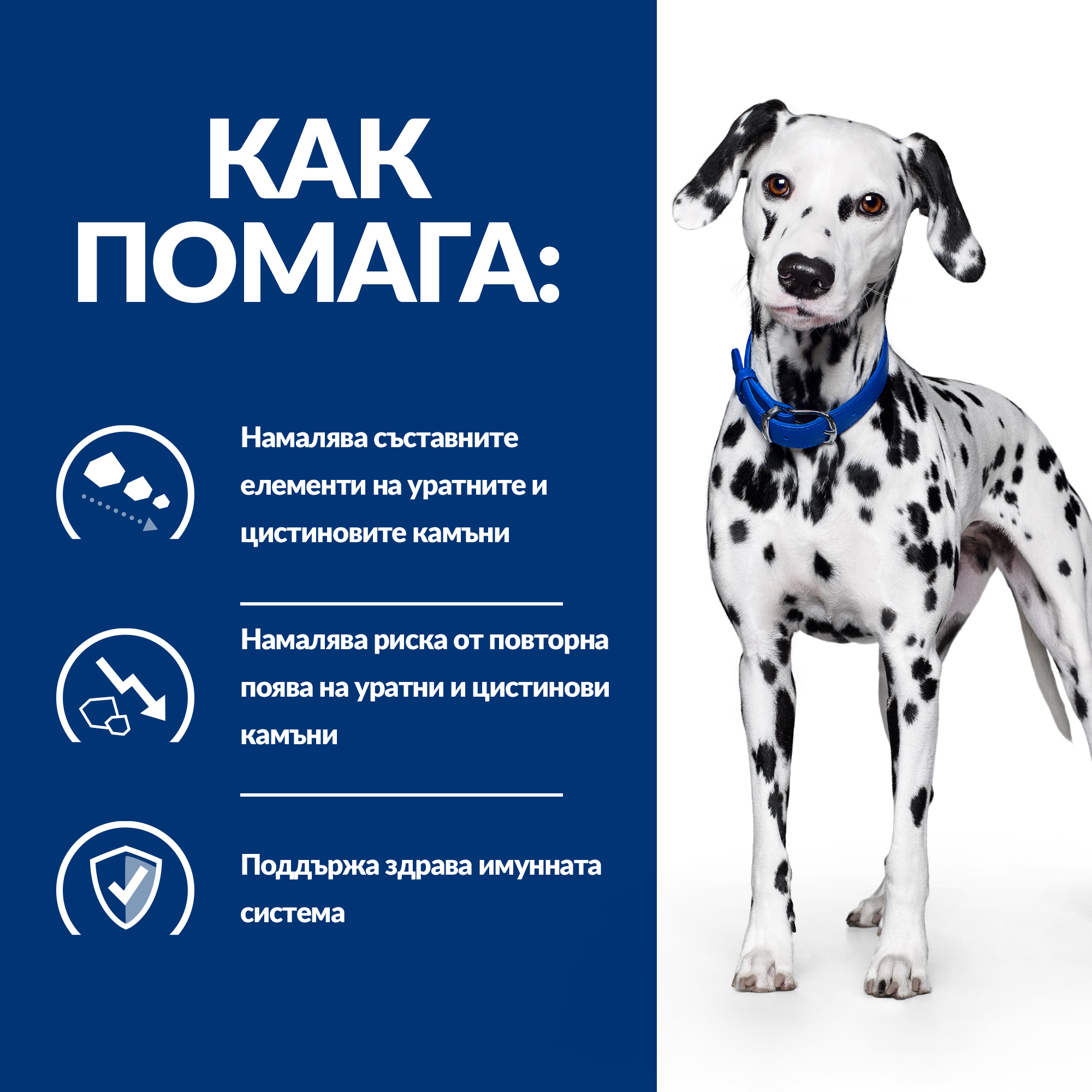 Hill’s PRESCRIPTION DIET u/d е диетична храна за кучета за намаляване на риска от уратни и цистинови камъни. Тази храна за кучета поддържа пикочния мехур и намалява риска от образуване на кристали и камъни. Тази суха храна има апетитен вкус, който кучето ви ще обикне.