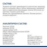 СЪСТАВ: Зърнени култури, производни от растителен произход, масла и мазнини, яйца и яйчни производни, минерали, месо и животински производни, семена. Източник на протеин: Сушени цели яйца. Вещества, алкализиращи урината: Калиев цитрат, калциев карбонат.