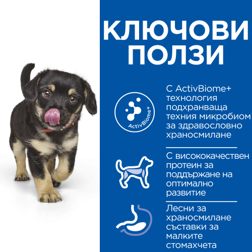 Hill’s Science Plan Perfect Digestion Puppy за кученца съдържа ActivBiome+, ексклузивният микс от пребиотици на Hill’s, който подхранва уникалния микробиом на кучето и му помага да достигне пълния си потенциал.
