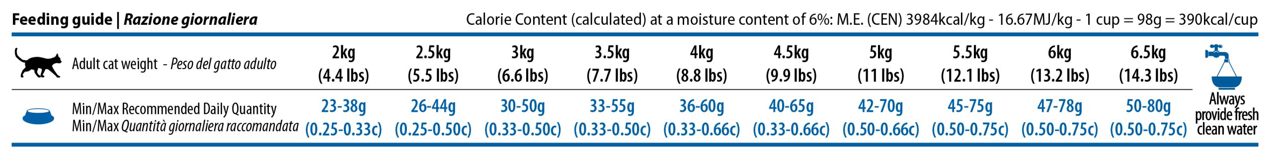 Аналитични съставки: Суров протеин 33.00%; Сурови масла и мазнини 16.50%; Сурови влакнини 2.10%; Влага: 9.00%; Сурова пепел 7.90%; Калций 1.00%; Фосфор 0.90%; Магнезий 0.08%; Омега-6 мастни киселини* 3.20%; Омега-3 мастни киселини* 0.40%; DHA* 0.15%; EPA* 0.10%; Глюкозамин* 1200мг/кг; Хондроитин сулфат* 900мг/кг. * Не се признава за основен хранителен елемент от профилите на хранителните продукти за котки AAFCO.