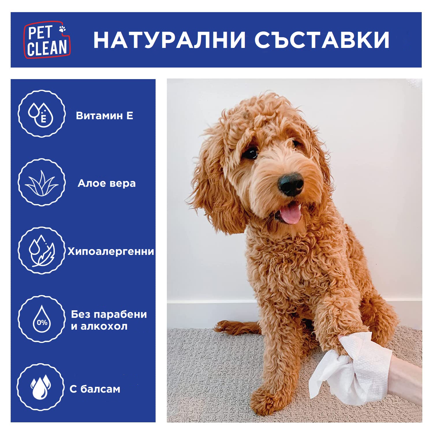 PET CLEAN Pet Grooming Wipes for Dogs & Cats – Кърпи за почистване и дезинфекция с натурални хипоалергенни съставки и алое, за кучета и котки