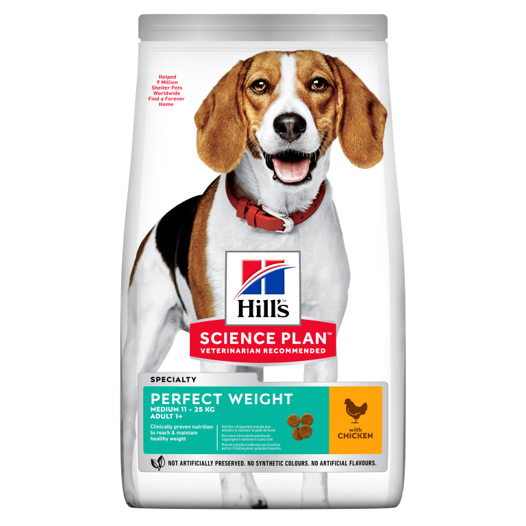 HILL’S SCIENCE PLAN Perfect Weight Medium Adult Chicken – пълноценна суха храна за намаляване и поддържане на теглото при кучета от средни породи (10-25 кг) над 1 година