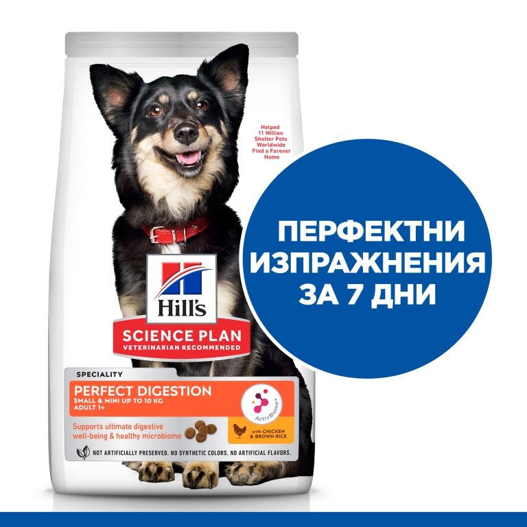 Hill’s Science Plan Perfect Digestion Small&Mini Adult Dog 1+ с пилешко и кафяв ориз – Пълноценна суха храна за кучета от малки и мини породи (до 10кг) от 1 до 6г., с ActivBiome+ за отлично храносмилане и здравословен чревен микробиом