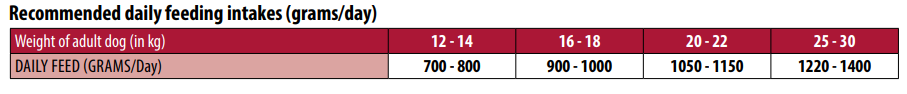 ИНСТРУКЦИИ ЗА ХРАНЕНЕ: препоръчителни дневни дажби (виж таблицата) могат да се разделят на 2 приема. Давайте храната със стайна темперарура. След отваряне да се съхранява в хладилник и да се консумира в рамките на 2 дни. Не отваряйте, ако опаковката е повредена или издута. Съхранявайте на сухо и хладно. Винаги осигурявайте достъп до прясна и чиста вода. Само за кучета, не е подходяща за човешка консумация.