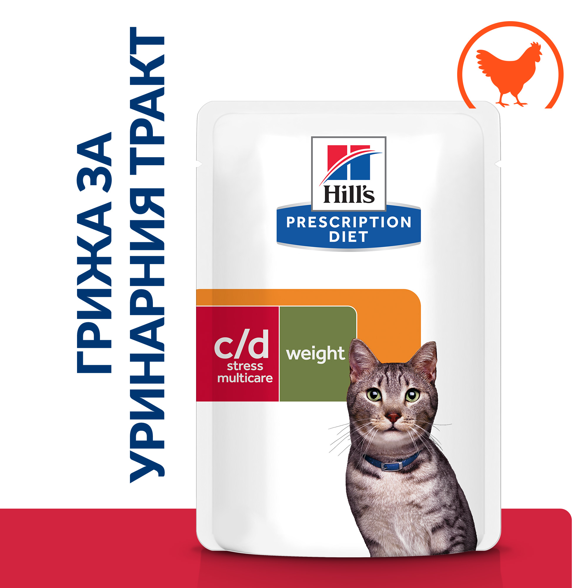Hill’s PRESCRIPTION DIET c/d Metabolic + Urinary Stress Pouch – лечебна мокра храна за котки с наднормено тегло и уринарни проблеми или идиопатичен цистит – пауч с пилешко