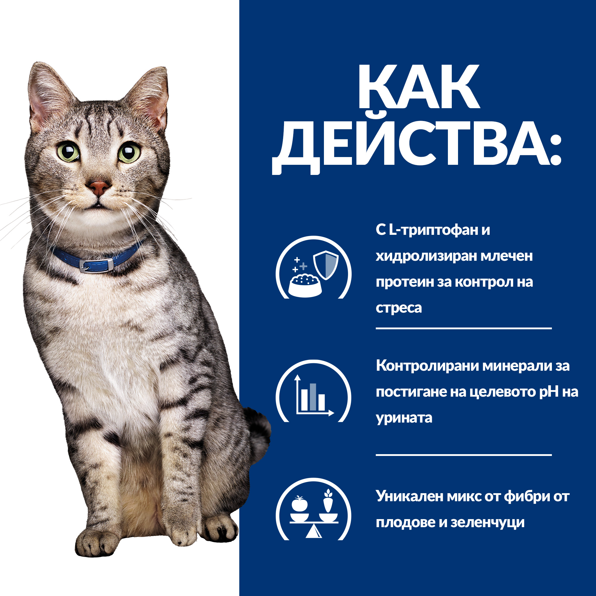 Храната за котки Hill’s PRESCRIPTION DIET c/d Urinary Stress + Metabolic е специална диетична формула за поддържане на пикочната система и теглото. Тази храна за контрол на теглото при котки доказано намалява рецидивите на най-честите уринарни симптоми с 89% и намалява теглото с 11% за 60 дни. Едновременно с това тя се грижи и за пикочната система и съдържа съставки за овладяване на стреса. Приготвя се с пилешко и има неустоим вкус, който котката ви ще обикне.