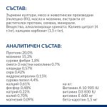 СЪСТАВ: Зърнени култури, месо и животински производни (пилешко 8%), масла и мазнини, екстракти от растителен протеин, семена, минерали. Вещества, алкализиращи урината: Калиев цитрат (4 г/кг), калциев карбонат (1,5 г/кг).