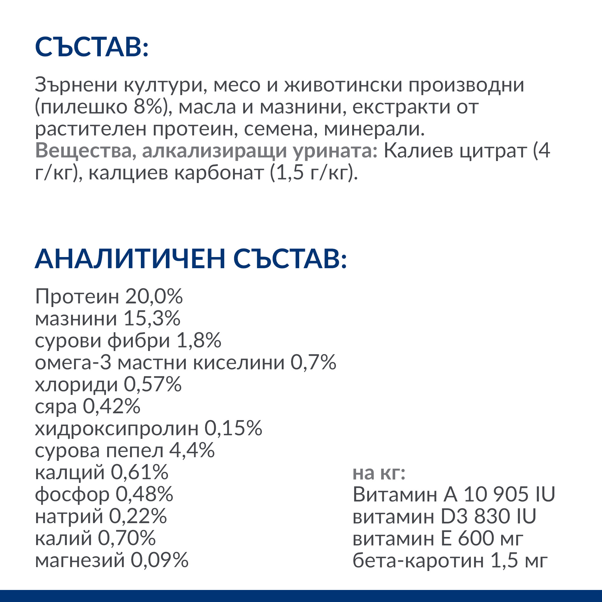 СЪСТАВ: Зърнени култури, месо и животински производни (пилешко 8%), масла и мазнини, екстракти от растителен протеин, семена, минерали. Вещества, алкализиращи урината: Калиев цитрат (4 г/кг), калциев карбонат (1,5 г/кг).