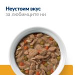 Hill’s PRESCRIPTION DIET c/d Multicare Urinary Care Stew е специално формулирана от хранителните експерти и ветеринарните лекари на Hilll’s за поддържане на пикочната система и намаляване на риска от струвитни и калциево-оксалатни камъни. Тази мокра храна се приготвя с пилешко и има неустоим вкус, който кучето ви ще обикне. Тя е с по-малки парченца, подходяща и за дребни породи кучета с малки усти.