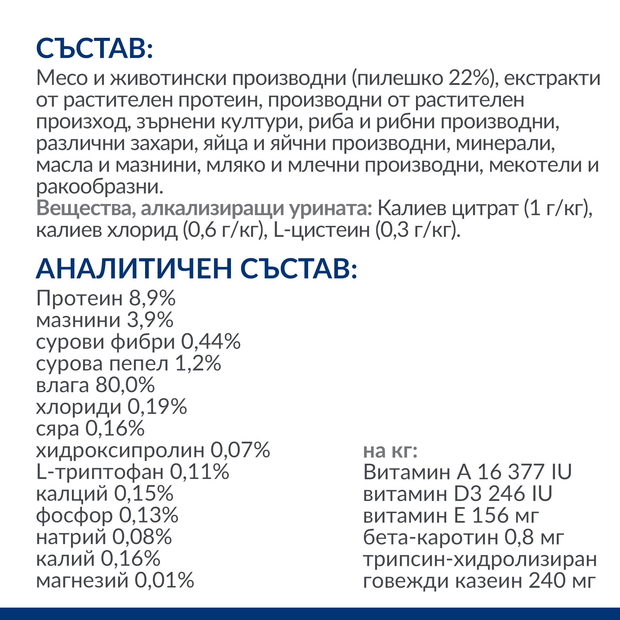 СЪСТАВ: Месо и животински производни (пилешко 22%), екстракти от растителен протеин, производни от растителен произход, зърнени култури, риба и рибни производни, различни захари, яйца и яйчни производни, минерали, масла и мазнини, мляко и млечни производни, мекотели и ракообразни. Вещества, алкализиращи урината: Калиев цитрат (1 г/кг), калиев хлорид (0,6 г/кг), L-цистеин (0,3 г/кг).