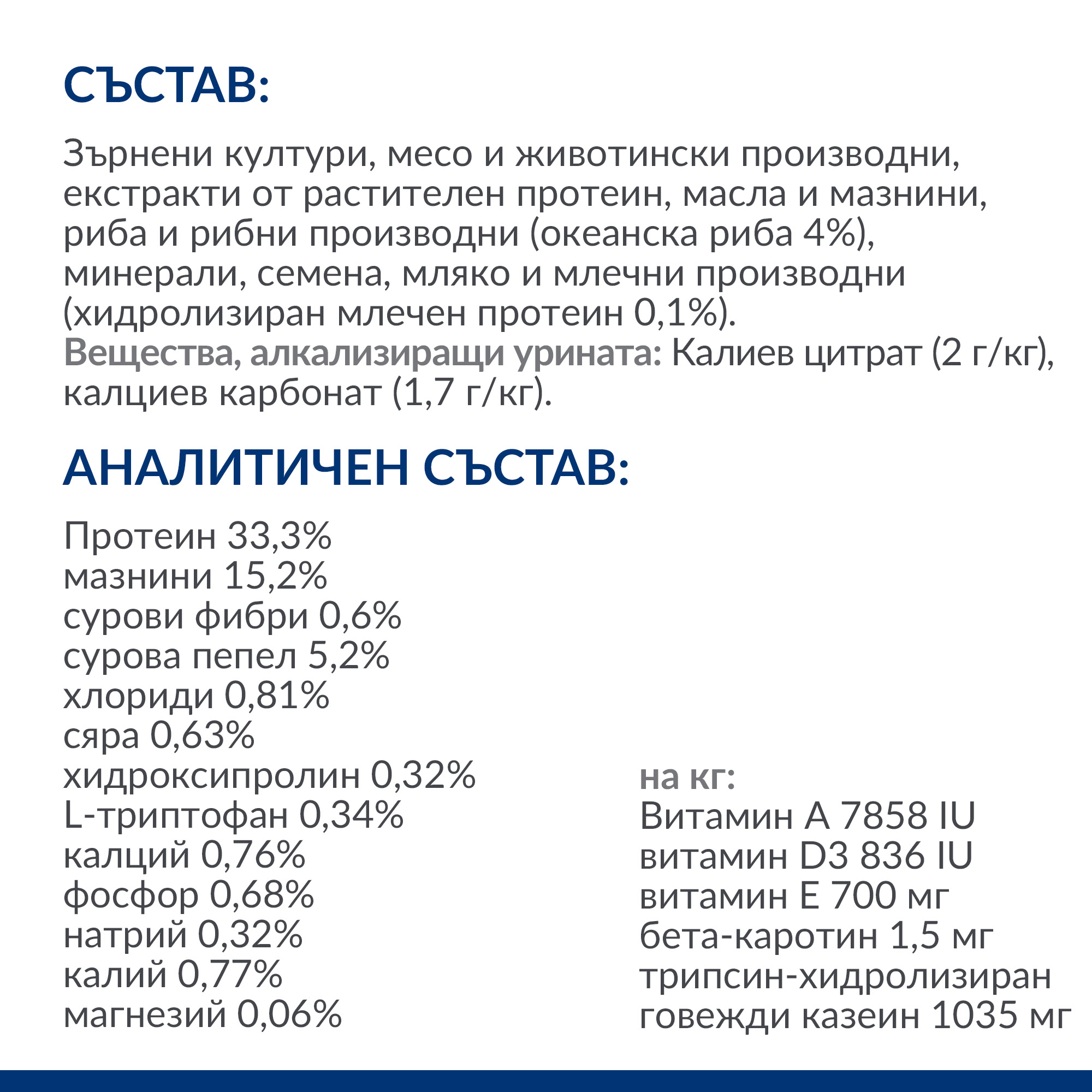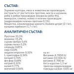 СЪСТАВ: Зърнени култури, месо и животински производни, екстракти от растителен протеин, масла и мазнини, риба и рибни производни (океанска риба 4%), минерали, семена, мляко и млечни производни (хидролизиран млечен протеин 0,1%). Вещества, алкализиращи урината: Калиев цитрат (2 г/кг), калциев карбонат (1,7 г/кг).