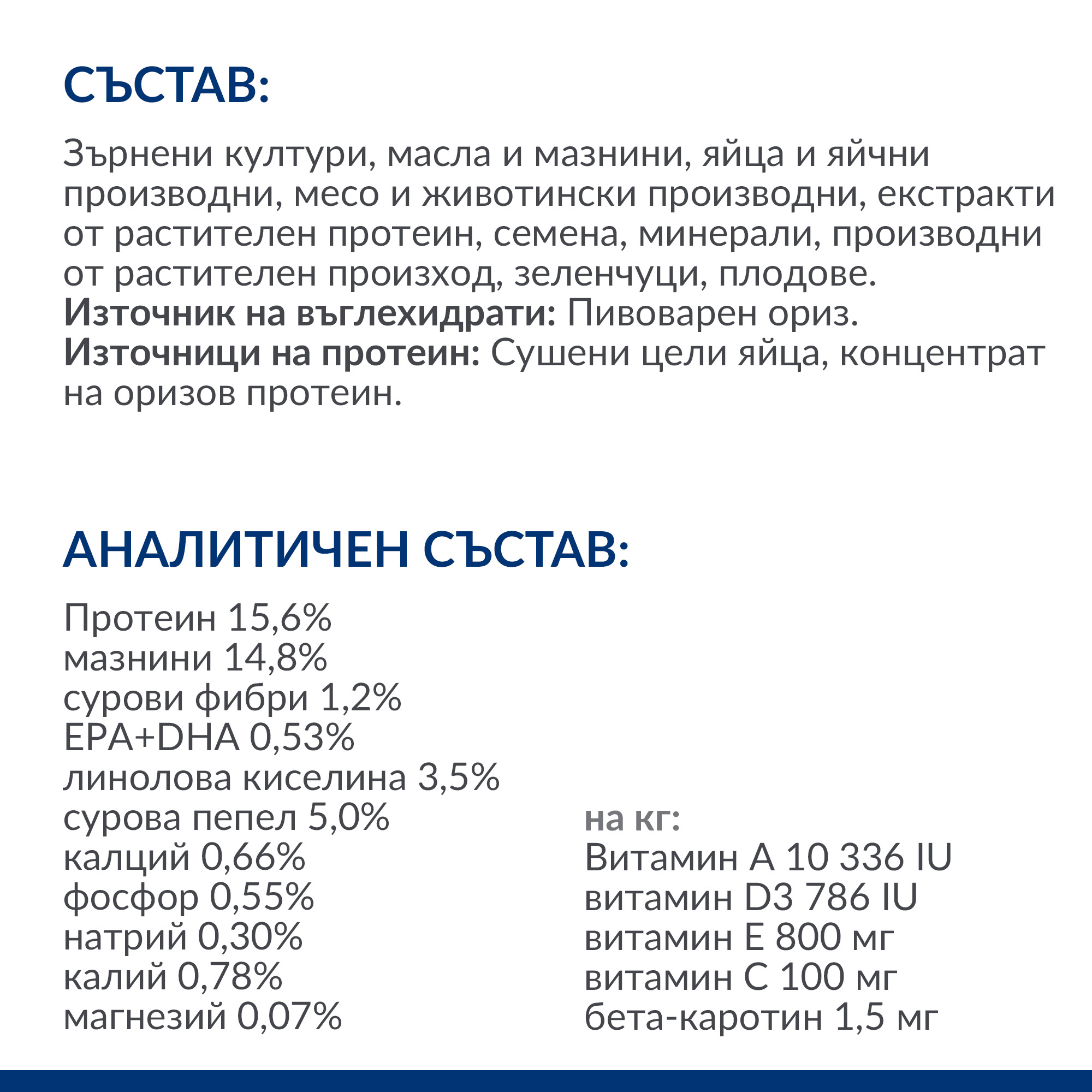 АНАЛИТИЧНИ СЪСТАВКИ: Протеин 15,6%, мазнини 14,8%, сурови фибри 1,2%, EPA+DHA 0,53%, линолова киселина 3,5%, сурова пепел 5,0%, калций 0,66%, фосфор 0,55%, натрий 0,30%, калий 0,78%, магнезий 0,07%; на кг: Витамин A 10 336 IU, витамин D3 786 IU, витамин E 800 мг, витамин C 100 мг, бета-каротин 1,5 мг.