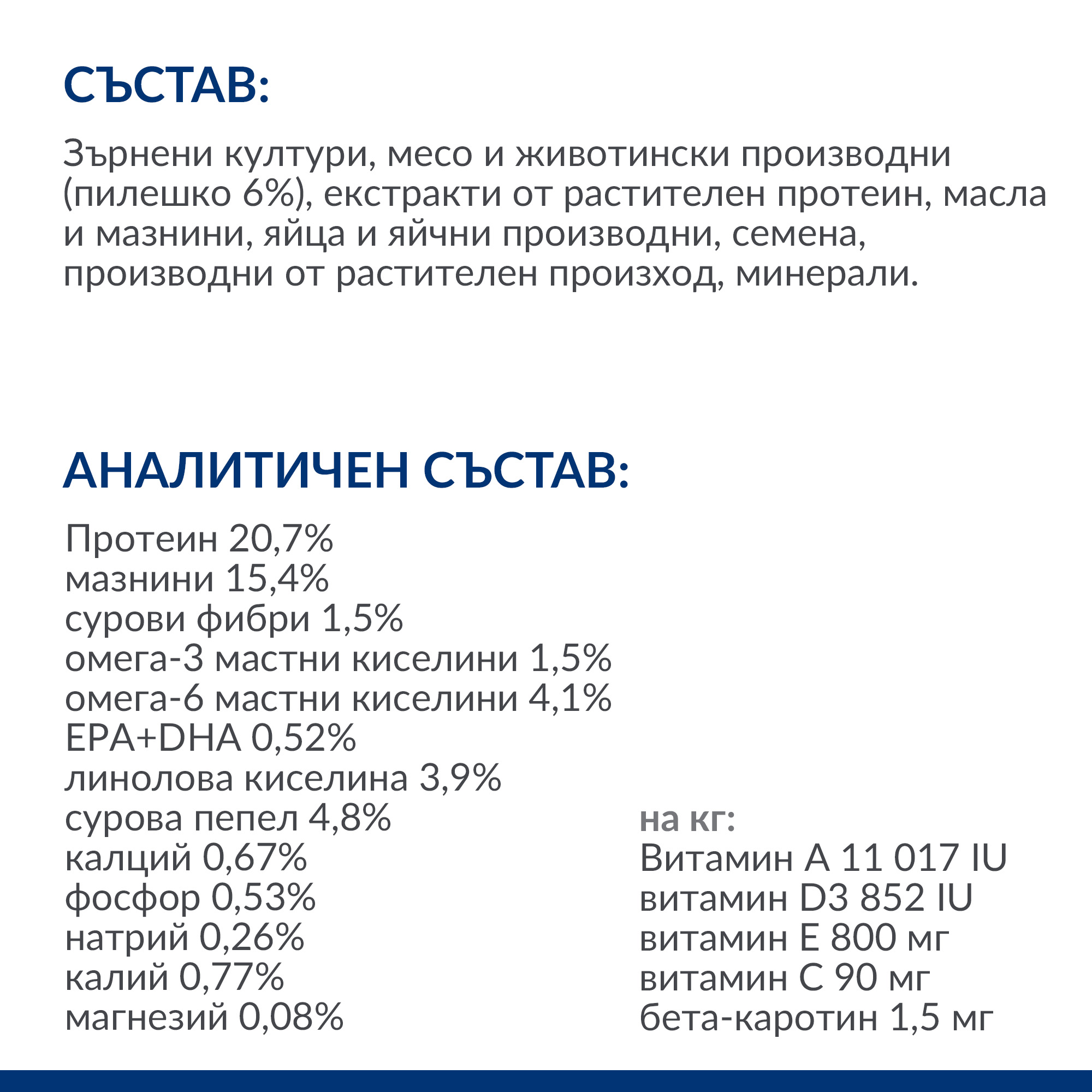 АНАЛИТИЧЕН СЪСТАВ: Протеин 20,7%, мазнини 15,4%, сурови фибри 1,5%, омега-3 мастни киселини 1,5%, омега-6 мастни киселини 4,1%, EPA+DHA 0,52%, линолова киселина 3,9%, сурова пепел 4,8%, калций 0,67%, фосфор 0,53%, натрий 0,26%, калий 0,77%, магнезий 0,08%; на кг: Витамин A 11 017 IU, витамин D3 852 IU, витамин E 800 мг, витамин C 90 мг, бета-каротин 1,5 мг.