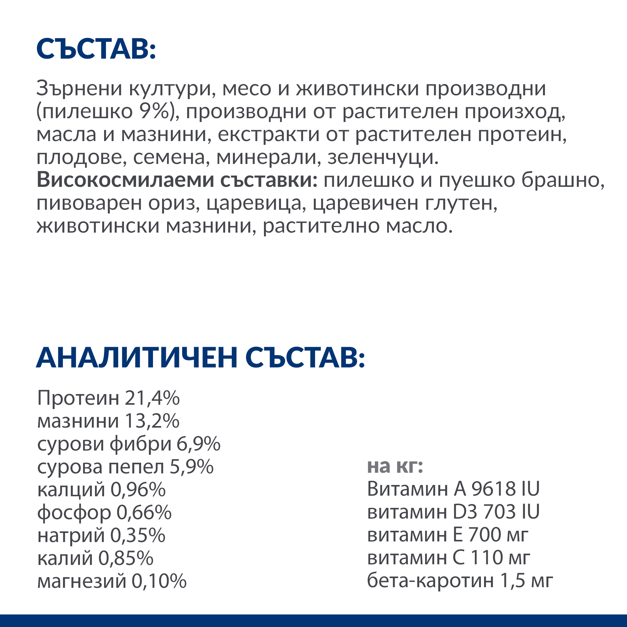 АНАЛИТИЧЕН СЪСТАВ: Протеин 21,4%, мазнини 13,2%, сурови фибри 6,9%, сурова пепел 5,9%, калций 0,96%, фосфор 0,66%, натрий 0,35%, калий 0,85%, магнезий 0,10%; на кг: Витамин A 9618 IU, витамин D3 703 IU, витамин E 700 мг, витамин C 110 мг, бета-каротин 1,5 мг.