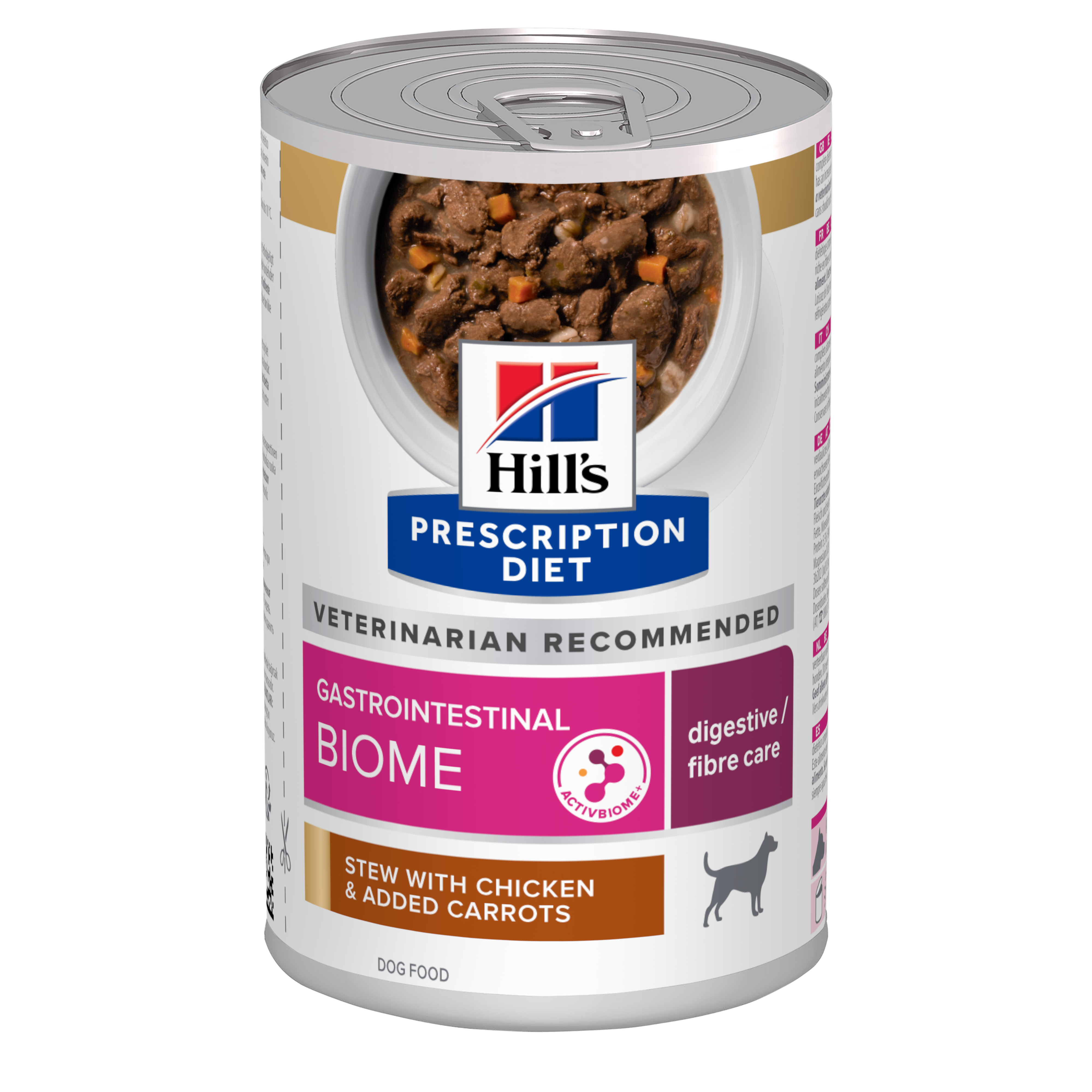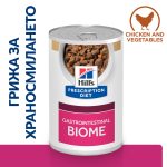 Hill’s PRESCRIPTION DIET Gastrointestinal Biome Stew – лечебна мокра храна за кучета с храносмилателни разстройства, запек, колит – консерва задушено пилешко с моркови