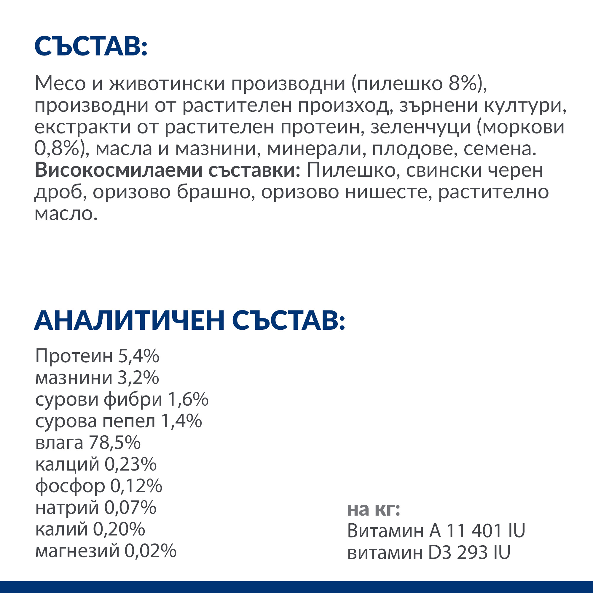 АНАЛИТИЧЕН СЪСТАВ: Протеин 5,4%, мазнини 3,2%, сурови фибри 1,6%, сурова пепел 1,4%, влага 78,5%, калций 0,23%, фосфор 0,12%, натрий 0,07%, калий 0,20%, магнезий 0,02%; на кг: Витамин A 11 401 IU, витамин D3 293 IU.
