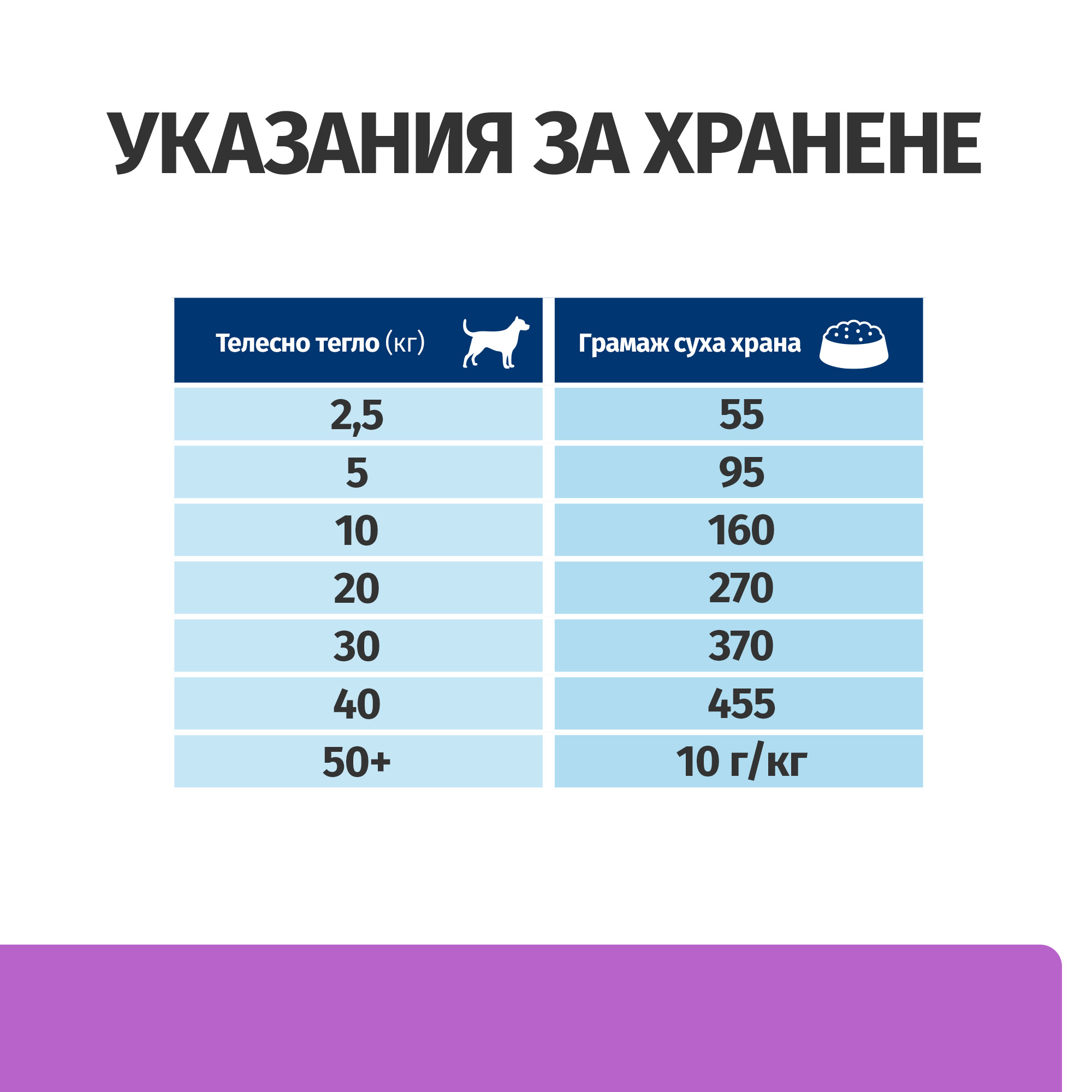Тегло на кучето — кгКоличество на ден – (г) – Зряла възрастКоличество на ден – (г) – Растеж под 4 месецаКоличество на ден – (г) – Растеж 4-9 месецаКоличество на ден – (г) – Растеж 10-12 месеца