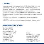 АНАЛИТИЧНИ СЪСТАВКИ:  Протеин 23,9%, мазнини 20,5%, сурови фибри 3,1%, сурова пепел 6,7%, калций 1,0%, фосфор 0,76%, натрий 0,39%, калий 0,85%, магнезий 0,09%; на кг: Витамин A 12 320 IU, витамин D3 1003 IU, витамин E 600 мг, витамин C 100 мг, бета-каротин 1,5 мг.