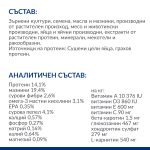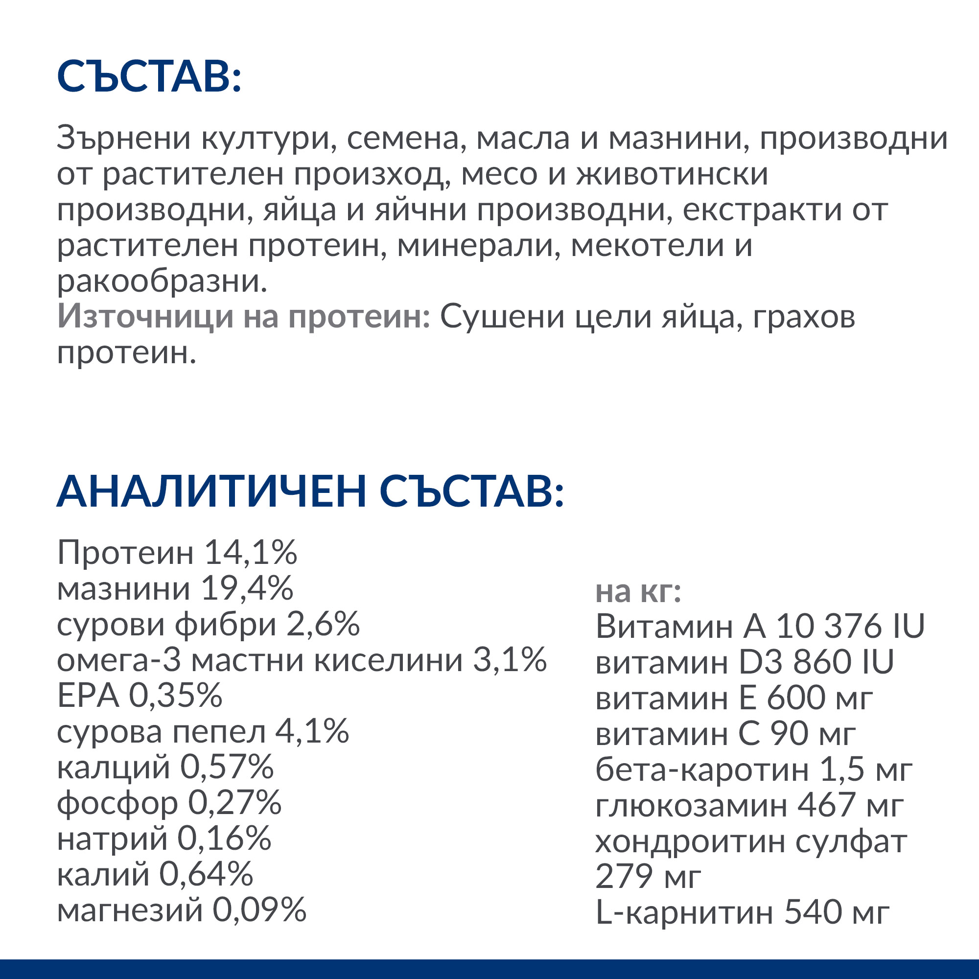 АНАЛИТИЧЕН СЪСТАВ: Протеин 14,1%, мазнини 19,4%, сурови фибри 2,6%, омега-3 мастни киселини 3,1%, EPA 0,35%, сурова пепел 4,1%, калций 0,57%, фосфор 0,27%, натрий 0,16%, калий 0,64%, магнезий 0,09%; на кг: Витамин A 10 376 IU, витамин D3 860 IU, витамин E 600 мг, витамин C 90 мг, бета-каротин 1,5 мг, глюкозамин 467 мг, хондроитин сулфат 279 мг, L-карнитин 540 мг.