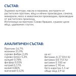 АНАЛИТИЧЕН СЪСТАВ: Протеин 16,7%, мазнини 21,9%, сурови фибри 2,4%, сурова пепел 5,2%, калций 0,78%, фосфор 0,55%, натрий 0,17%, калий 0,86%, магнезий 0,12%; на кг: Витамин A 27 814 IU, витамин D3 715 IU, витамин E 550 мг, витамин C 90 мг, бета-каротин 1,5 мг, общо мед 2,9 мг.