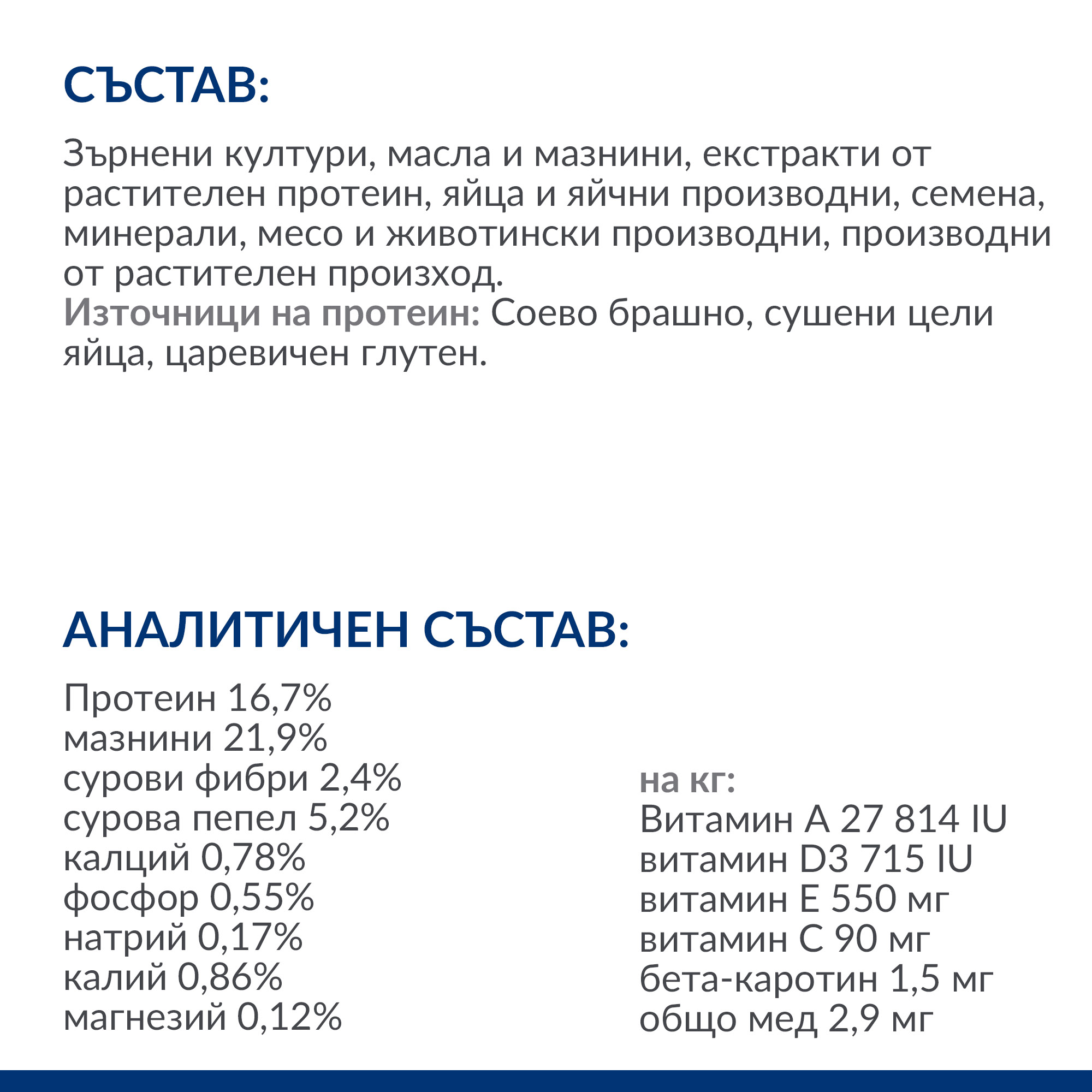 СЪСТАВ: Зърнени култури, масла и мазнини, екстракти от растителен протеин, яйца и яйчни производни, семена, минерали, месо и животински производни, производни от растителен произход. Източници на протеин: Соево брашно, сушени цели яйца, царевичен глутен.