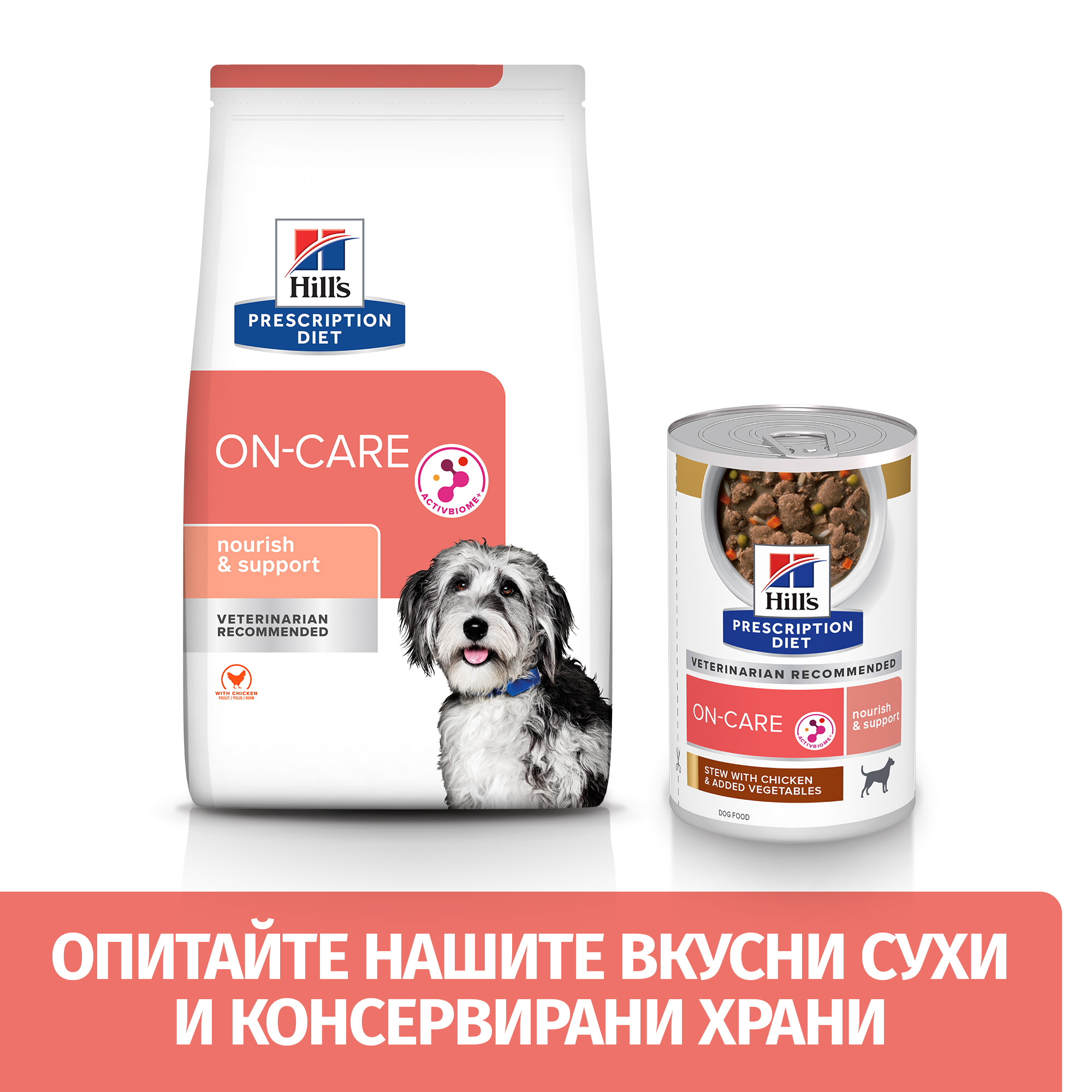 Hill’s Prescription Diet ON-Care е специално формулирана от нашите хранителни експерти и ветеринарни лекари за пълноценно хранене на кучета с тежки заболявания.