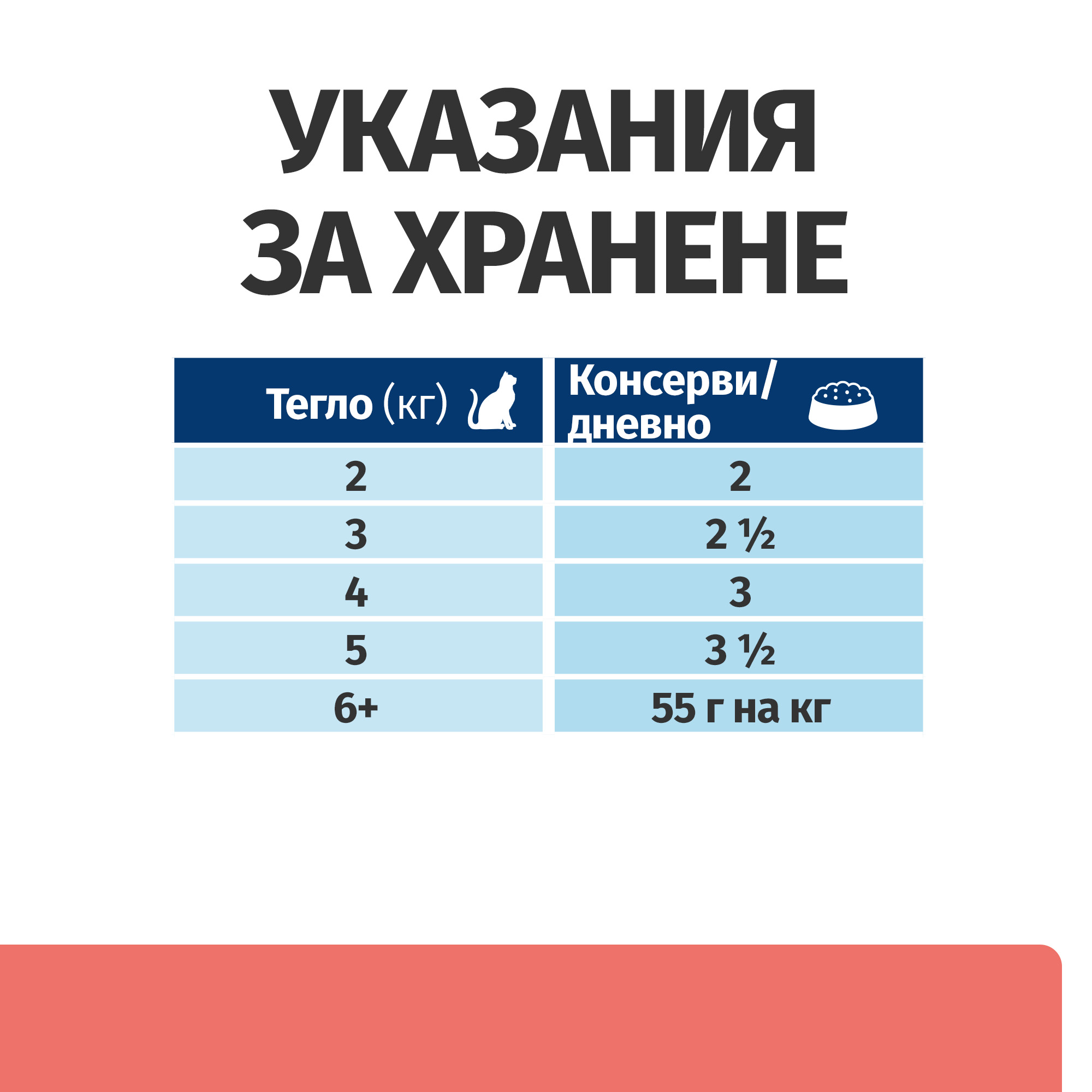 Поискайте от ветеринарния лекар да Ви даде конкретни указания за храненето на Вашия домашен любимец. Това са само общи насоки. Грамовете са най-точната форма на измерване. Ако използвате мерителна чашка на Hill’s, вижте cup.hillspet.com.