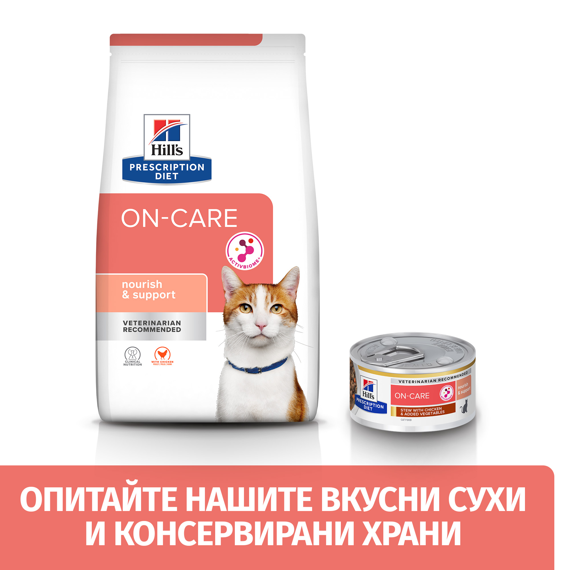 Hill’s PRESCRIPTION DIET ON-CARE STEW – лечебна мокра храна за котки, страдащи от тежки заболявания, с пилешко и зеленчуци