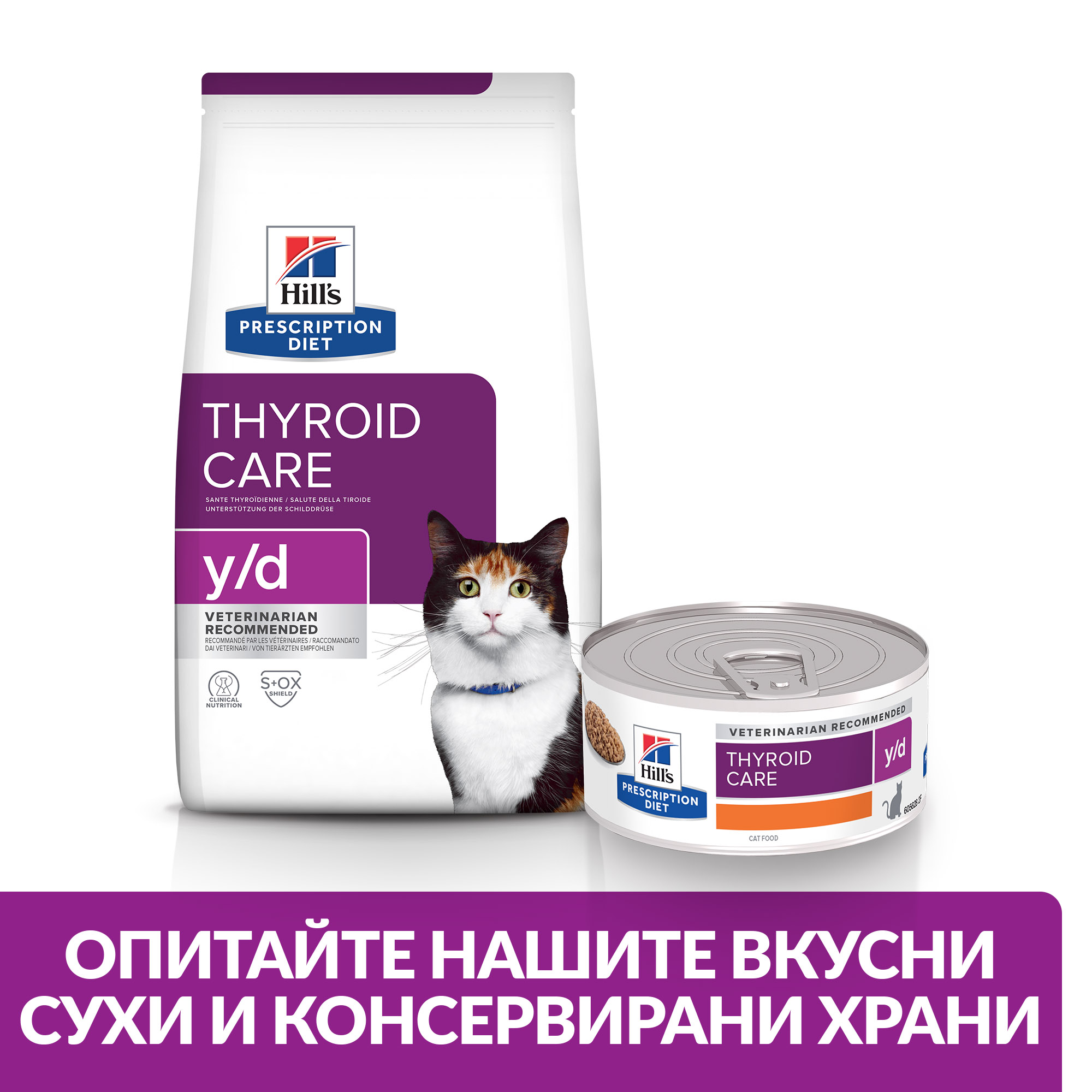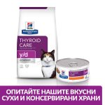 Храната за котки Hill’s PRESCRIPTION DIET y/d Thyroid Care клинично доказано намалява производството на щитовидни хормони за 3 седмици, когато се явява единствен източник на храна. Тази храна е лесен и удобен начин да се намали нивото на йод при котките с повишена функция на щитовидната жлеза. Дългосрочното, системно хранене с този продукт е от ключово значение за неговата ефикасност срещу щитовидни проблеми при котките. Сухата храна и консервите могат да се смесват или дават паралелно. Тази мокра храна има неустоим вкус, който котката ви ще обикне.