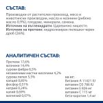 СЪСТАВ: Производни от растителен произход, месо и животински производни, масла и мазнини (рибено масло 0,9%), плод, минерали, семена. Източник на протеин: хидролизиран пилешки черен дроб. Източник на въглехидрати: Царевично нишесте.