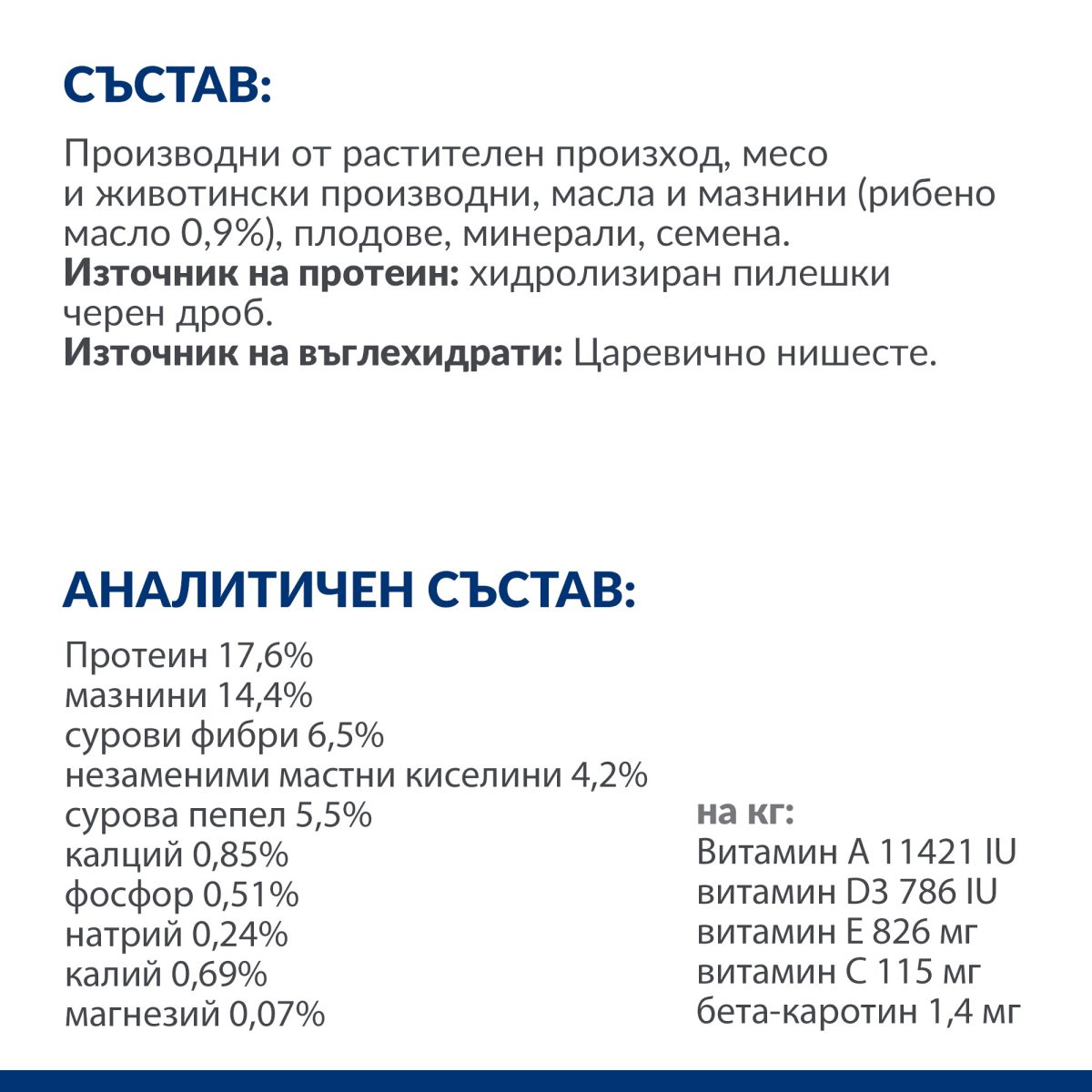 - Хидролизиран животински протеин за минимизиране на признаците на нежелани хранителни реакции.