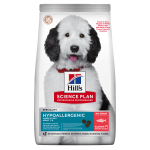 Hill’s Science Plan Hypoallergenic Large Breed Adult със сьомга е апетитна хипоалергенна суха храна за кучета от едри породи на възраст 1–6 години. Тя е формулирана с ограничени източници на висококачествен протеин и без зърнени култури специално за нуждите на чувствителните кучета. Специална формула с единствен източник на животински протеин от висококачествена сьомга и риба тон, щадяща стомаха – с картофи и други лесно смилаеми съставки, и с омега-3 и омега-6 мастни киселини за подхранване на кожата.