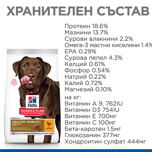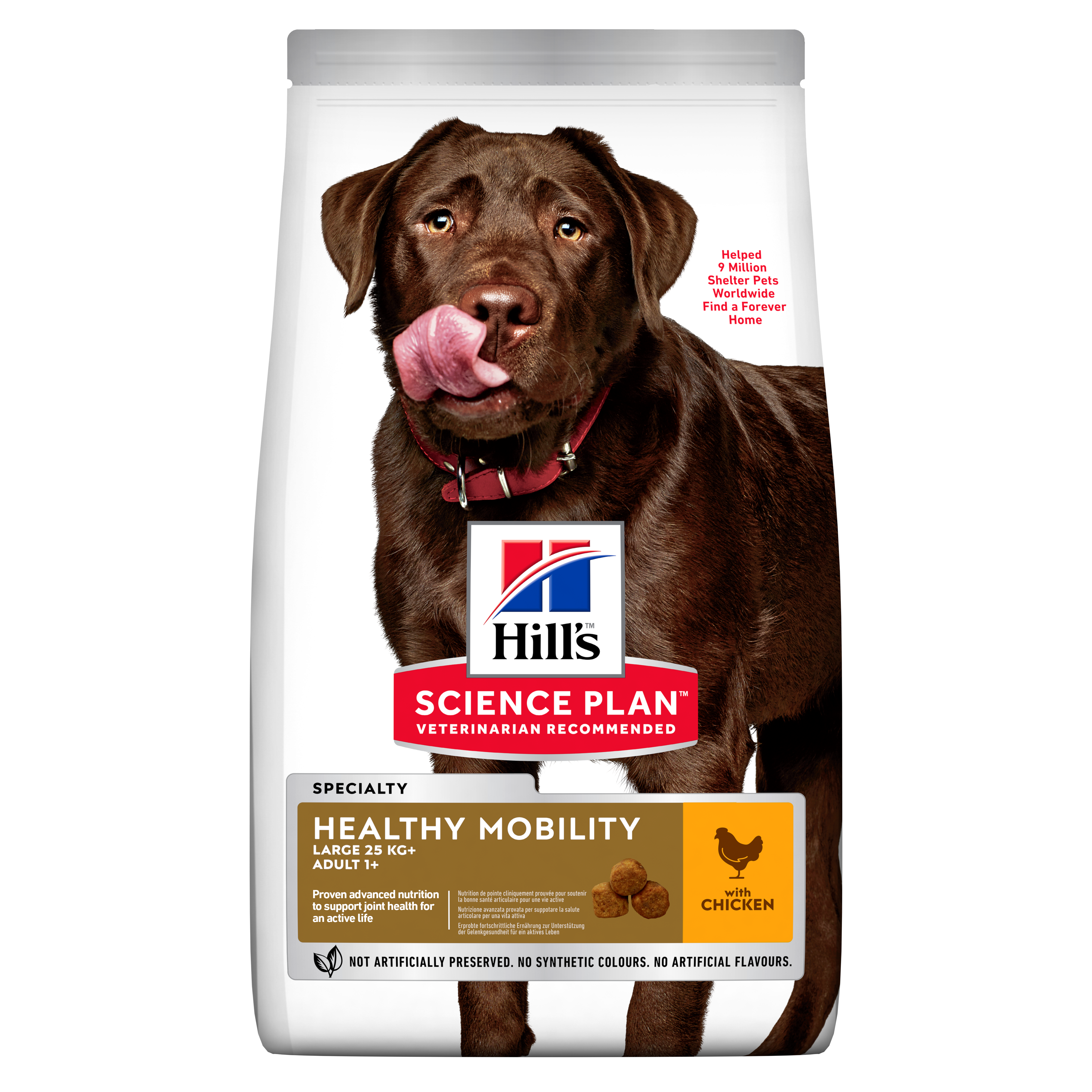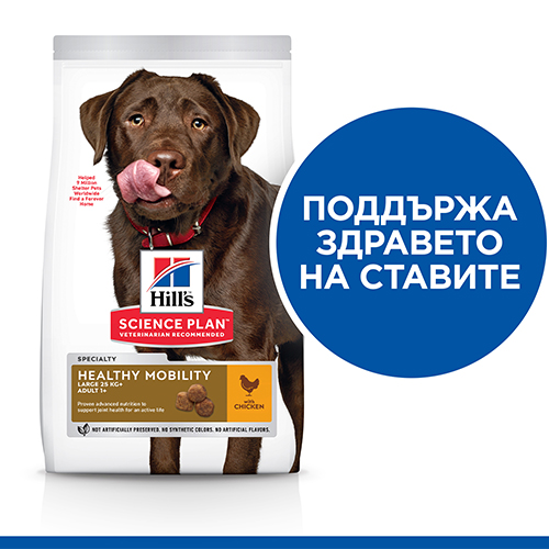 HILL’S SCIENCE PLAN Healthy Mobility Large Breed Adult е пълноценна храна с пилешко за кучета от едрите породи (над 25кг) над 1 год. , специално формулирана за поддържане на здравето на ставите и подобряване на мобилността за активен живот.