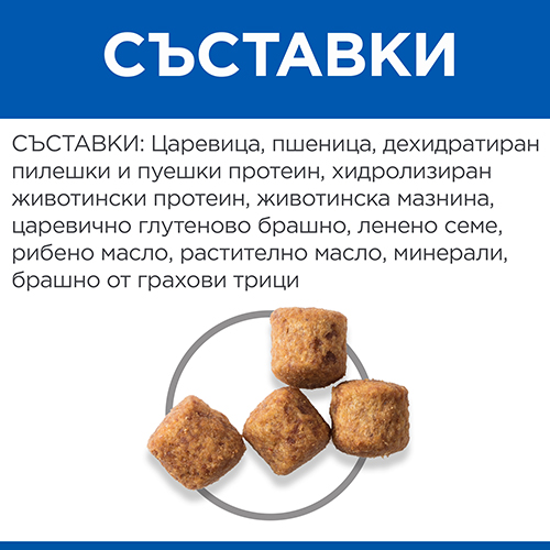 СЪСТАВ: Царевица, пшеница, дехидратиран пилешки и пуешки протеин, хидролизиран животински протеин, животинска мазнина, царевично глутеново брашно, ленено семе, рибено масло, растително масло, минерали, брашно от грахови трици.