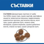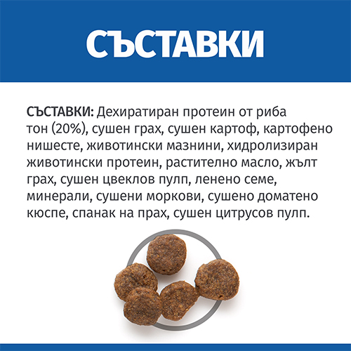 СЪСТАВ: дехидратиран протеин от риба тон, сушен грах, сушен картоф, картофена скорбяла, животинска мазнина, хидролизиран животински протеин,  растително масло, жълт грах, сушена цвеклова каша, ленено семе, минерали, сушени моркови, сушено доматено кюспе, спанак на прах, сушена цитрусова пулпа.
