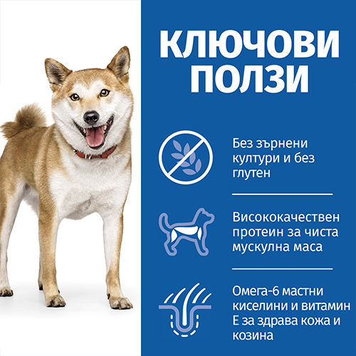 Hill’s Science Plan NO GRAIN Medium Adult  Tuna e  специално формулирана да посрещне енергийните им нужди в разцвета на годините им. С нова рецепта без съдържание на зърнени култури и глутен. С 20 % съдържание на риба тон. Приготвена с висококачествени, лесносмилаеми съставки, с висококачествен протеин за поддържане на чистата мускулна маса. Балансираният микс от омега-6 мастни киселини и витамин Е подхранва кожата, за да има кучето ви здрава и блестяща козина.