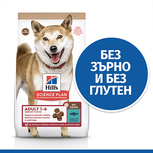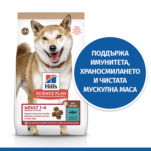 HILL’S SCIENCE PLAN NO GRAIN Medium Adult Tuna – пълноценна суха храна с риба тон за кучета от средните породи (11-25кг ) от 1 до 6 години, без зърнени култури