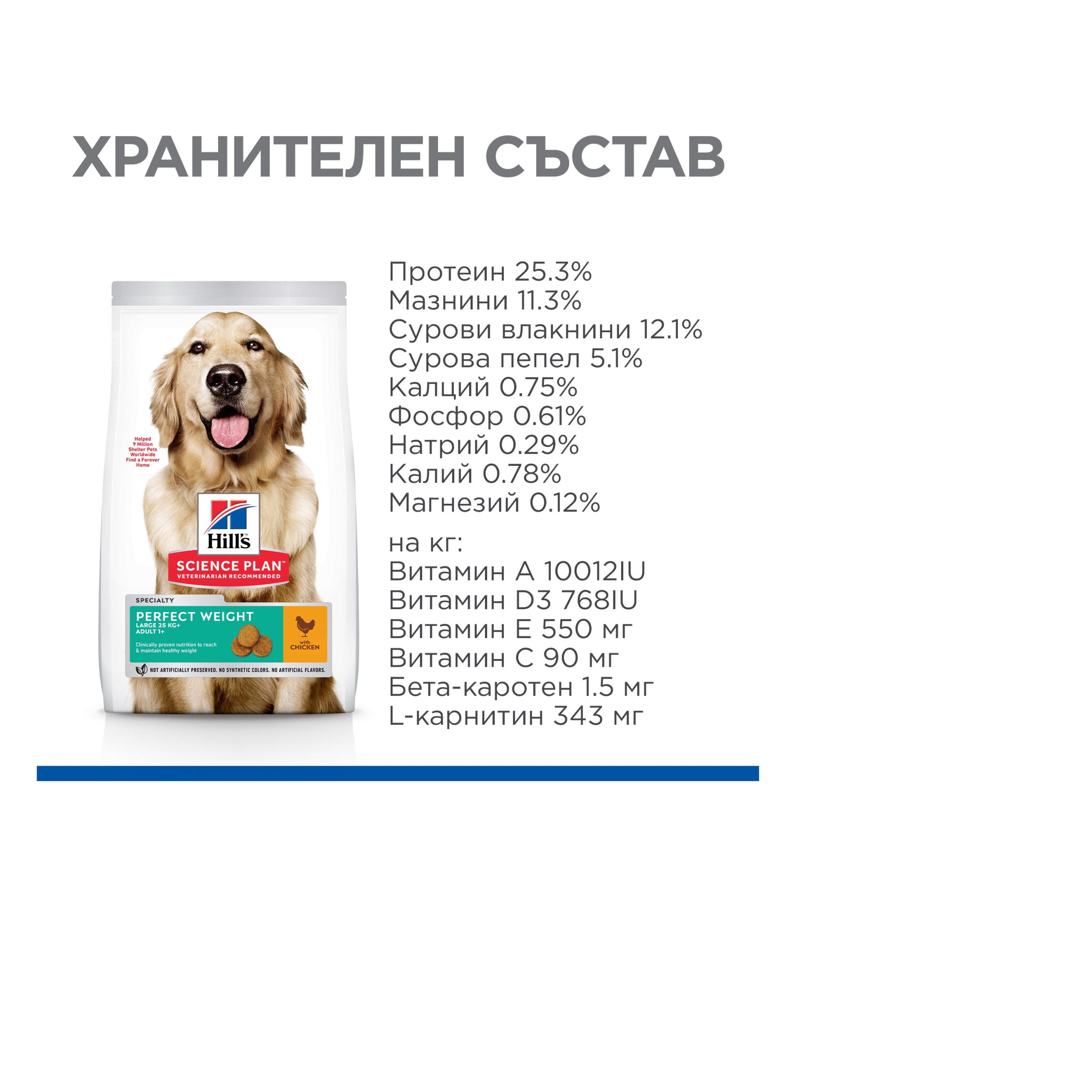 HILL’S SCIENCE PLAN Perfect Weight Large Breed Adult е пълноценна храна с пилешко за кучета от едрите породи (над 25кг) над 1 год., с наднормено тегло или с тенденция за натрупване на тегло.  Клинично доказано хранене за достигане и поддържане на здравословно тегло. Високопротеинова, богата на фибри формула, обогатена с L-карнитин и кокосово масло за поддържане на метаболизма.