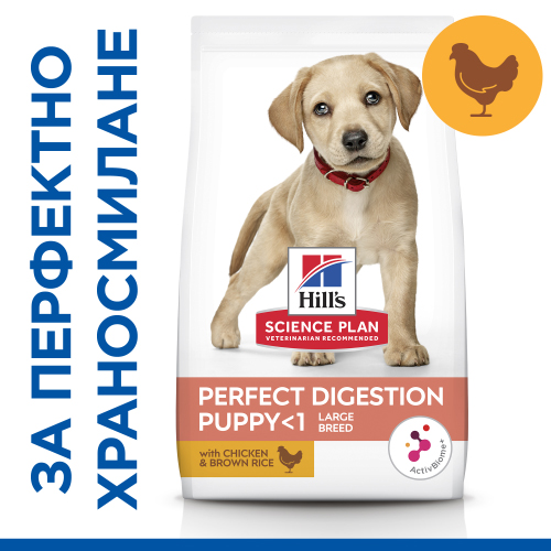 Hill’s Science Plan Puppy Perfect Digestion Large – пълноценна суха храна за отлично храносмилане за кученца до 1 година от едри породи, с пилешко и кафяв ориз