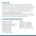 СЪСТАВ: Царевица, дехидратиран пилешки и пуешки протеин (пилешко 16%; общо домашни птици 25%), пивоварен ориз, животински мазнини, овкусител от животински произход, кафяв ориз (4%), ечемик, овес, целулоза, минерали, смлени черупки от пекан, ленено семе, сушена цвеклова пулпа, сушена цитрусова пулпа, рибено масло, растително масло, сушени червени боровинки. Пребиотичен премикс ActivBiome+ (4%): Смлени черупки от пекан, ленено семе, сушена цвеклова пулпа, сушена цитрусова пулпа, сушени червени боровинки.