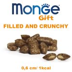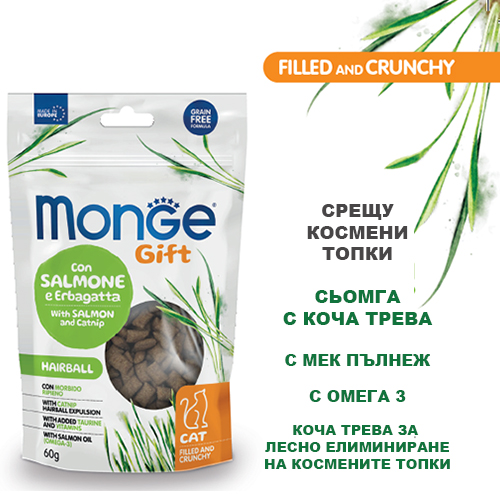 MONGE GIFT FILLED AND CRUNCHY HAIRBALL CAT – лакомство за котки срещу космени топки, със сьомга и коча трева, без зърнени култури