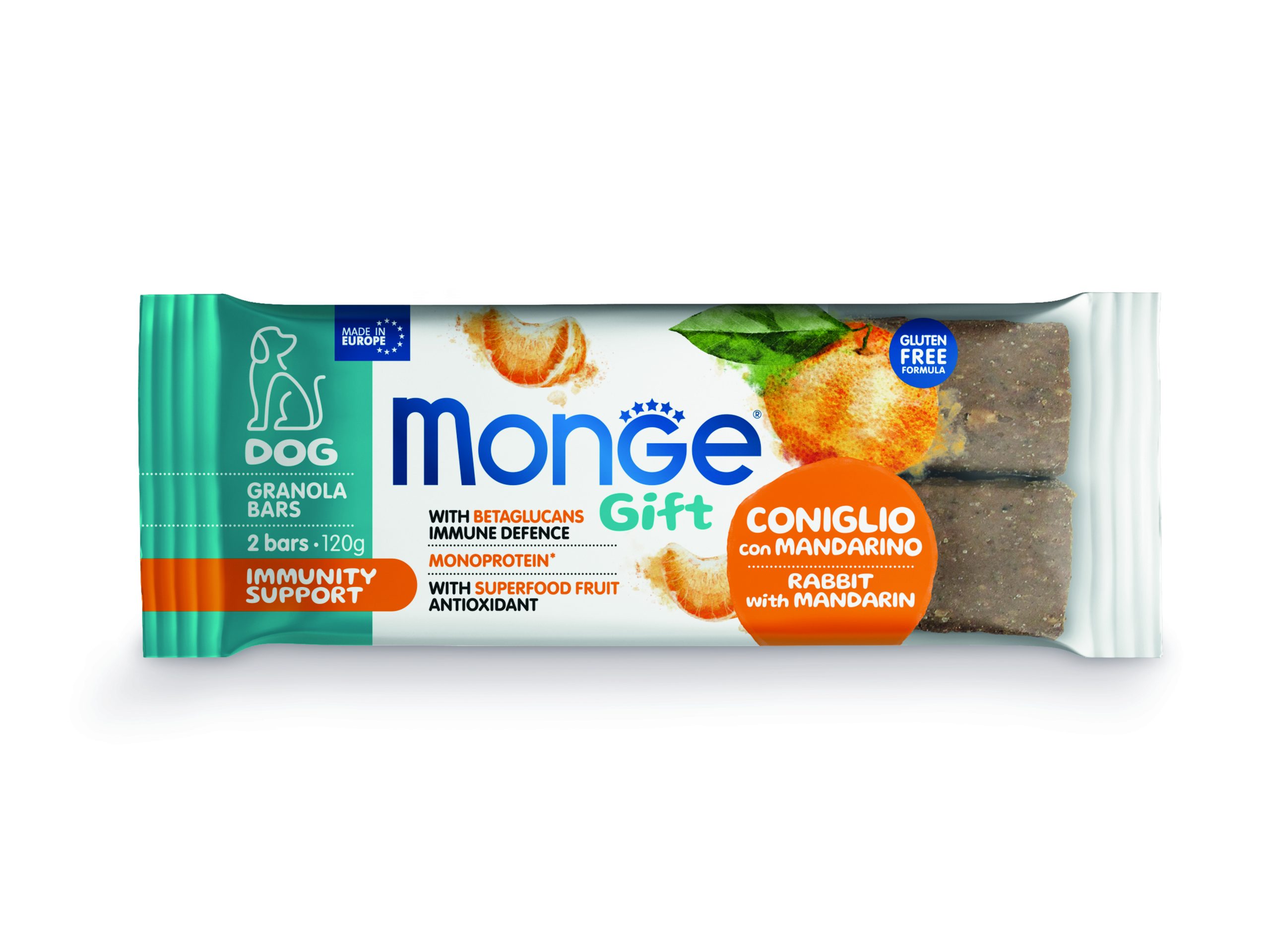 Monge Gift Granola Bars Immunity Support – лакомство за кучета – монопротеинови барчета със заешко и мандарини за подсилване на имунитета, безглутенови