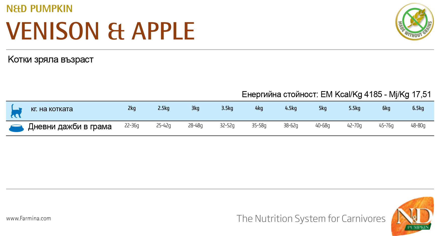 N&D Adult Cat Pumpkin Venison & Apple – суха храна за котки без зърнени култури, с еленско месо, тиква и ябълка